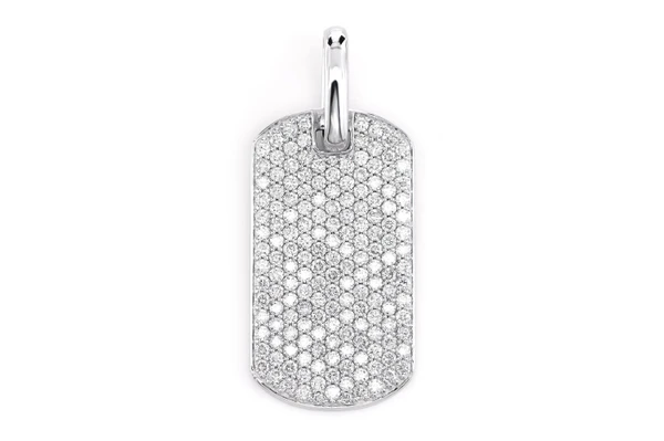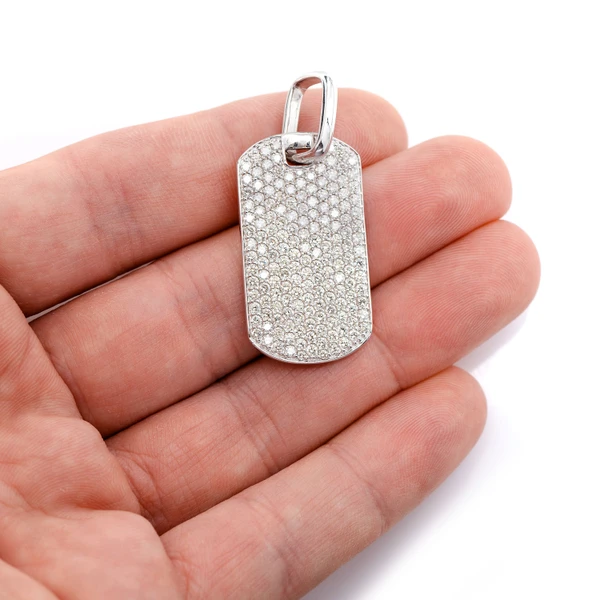 The Iceshop diamond pave dog tag pendant is a masterpiece that redefines elegance. Its entire face is adorned with pave-set diamonds, creating an exquisite surface that radiates brilliance. With a remarkable 3.30ctw of dazzling diamonds, this pendant is designed to capture attention and exude luxury wherever you go. Prepare to shine with this striking piece that is sure to make heads turn.
